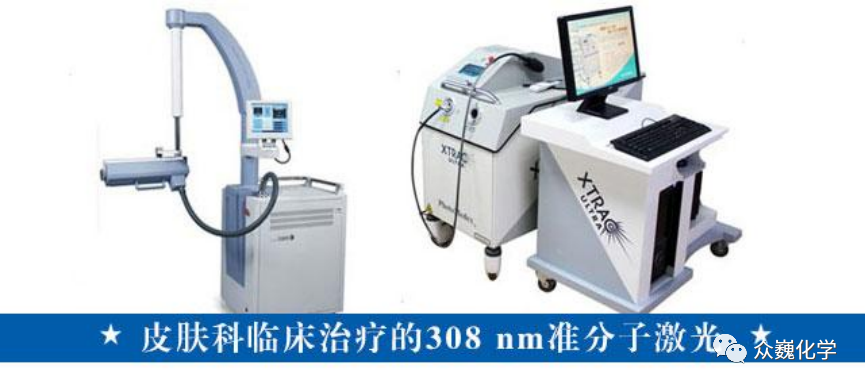 308 纳米(nm)准分子激光是由氯化氙( XeCI )为激光工作物质而产生的波长为 308nm 的激光。308nm准分子激光属脉冲气体激光,为单频准分子激光,波长与窄谱中波紫外线(NB-UVB)相似,但与窄谱UVB不同的是它是选择性作用于皮损局部,能量是窄谱UVB的5-10倍,不仅可以在一定程度上降低光老化和表皮恶性肿瘤的危险性,同时能产生高能量的窄谱UVB达到治疗目的。通过改变可溶性介质的分泌,从而影响表皮免疫反应,同时诱导T淋巴细胞凋亡,发挥其临床治疗作用,且308nm是诱导白癜风皮损中病理性T细胞凋亡的波长。通过激光直接照射皮损部位引起相关的生物和化学变化,从而达到治疗目的。另外,308准分子激光还具有调节免疫、促进很多炎症因子分泌的作用,能够促使患者的皮疹尽快的愈合。308准分子激光同时还可以治疗银屑病、湿疹、白斑病、特应性皮炎、自身敏感性皮炎、斑秃等。