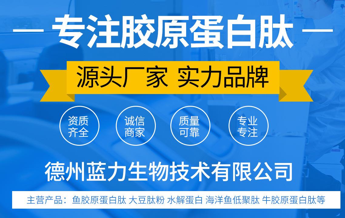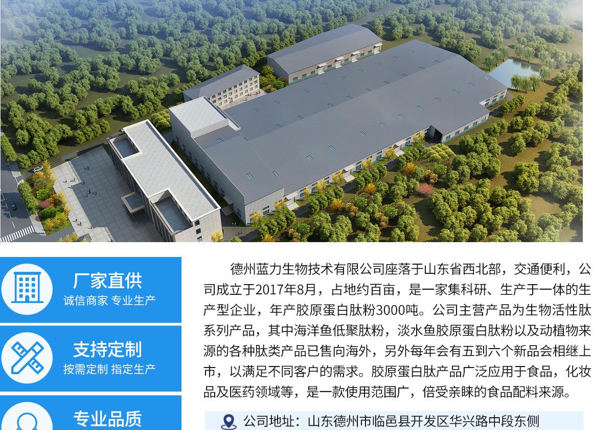 蓝力生物经营范围包括:生物科技领域内的技术研发、技术咨询、技术服务;食品用胶原蛋白、蛋白粉、肽及氨基酸的研发、生产及推广销售;固体饮料、方便食品、保健食品研发、生产、销售;化妆品、保健用品、日用品销售,及以上商品的进出口业务等。蓝力生物生产的产品包括深海鱼胶原蛋白肽粉/颗粒,淡水鱼胶原蛋白肽粉/颗粒,牛胶原蛋白肽粉/颗粒,牛骨胶原蛋白肽粉/颗粒,大豆低聚肽,养胎盘肽粉,阿胶太,燕窝肽,牡蛎肽,人参肽,小麦肽等等。 公司占地面积约26666平方米,年生产各类蛋白肽约2000吨,自公司成立以来,制定了一整套标准化生产流程,同时也培养了一批具有丰富经验的工程技术管理人员,目前,公司有专家教授2名,具有本科学历以上的科研人员8名,高级管理人员3名。公司先后通过了国家实验室认可,并且通过了质量管理体系ISO22000renzheng ,HACCP认证,以及HALAL认证。公司产品符合世界卫生组织及国家食品标准要求,主要销往北美,南美,以及日,韩,东南亚部分国家和地区。 蓝力本着质量第一,诚信为本,顾客满意,持续改进的原则,欢迎海内外企业,客户来我司考察洽谈业务,合作模式多样化,灵活化,共同推进世界大健康产业事业的蓬勃发展。 如果有兴趣可以致电我司,期待与贵公司的接洽与合作!