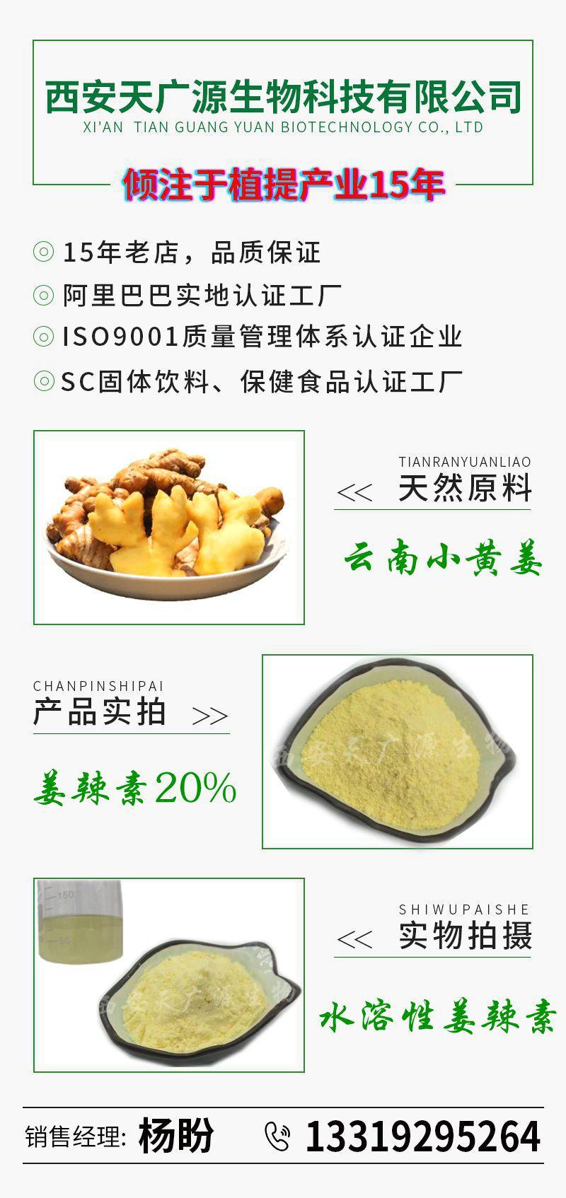 【外 观】: 黄色粉末。【检测方法】:HPLC【原料来源】:姜科多年生草本植物姜Zingiber officinale Rosc.的根茎