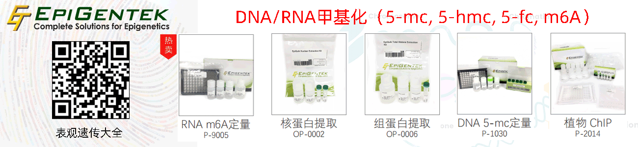 Epigentek 公司是全球领先的表观遗传学相关研究的技术创新者和产品开发供应商。开发了超过700多个专利产品,为表观遗传学方面的研究和新药研发提供全面系统的解决方案,涵盖样品制备、DNA/RNA甲基化(5-mc, 5-hmc, 5-fc, m6A)/DNMT分析、ChIP、组蛋白甲基化/乙酰化/去乙酰化/磷酸化/SUMO-等领域,提供小分子抑制剂、蛋白质、抗体、以及分析试剂盒产品。