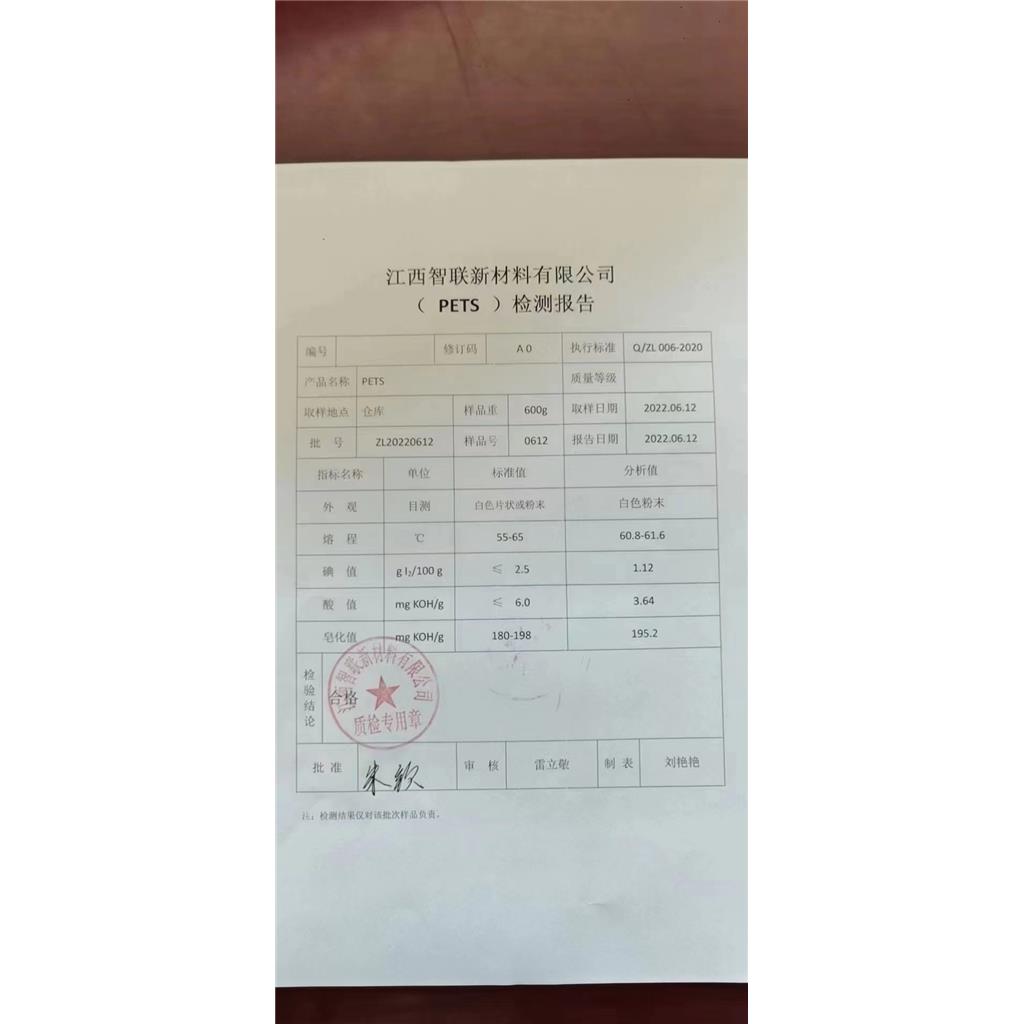 季戍四醇硬脂酸脂PETS为白色硬质高熔点蜡状物,可溶于乙醇、苯。 产品用途 本品尤其适合于塑料改性、工程塑料、PET、PBT、PS、PC、POM、TPU、尼龙、玻纤等高温环境中,起润滑、分散、光亮、脱模作用,在橡胶塑炼过程中作为增塑剂可以起到塑解和润滑的作用。 可用于聚氯乙烯等聚合物的加工中作为稳定剂,增塑剂和内润滑剂。可作高档润滑油配合剂,金属切削及制薄钢板的润滑剂,用作外润滑剂时,建议添加量为0.1-2% 技术指标 Q/ZL 006-2013