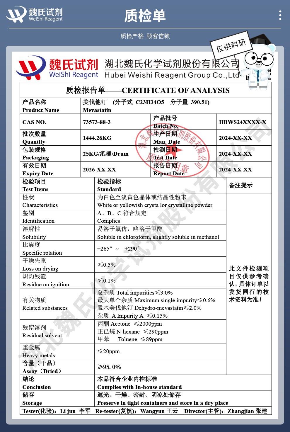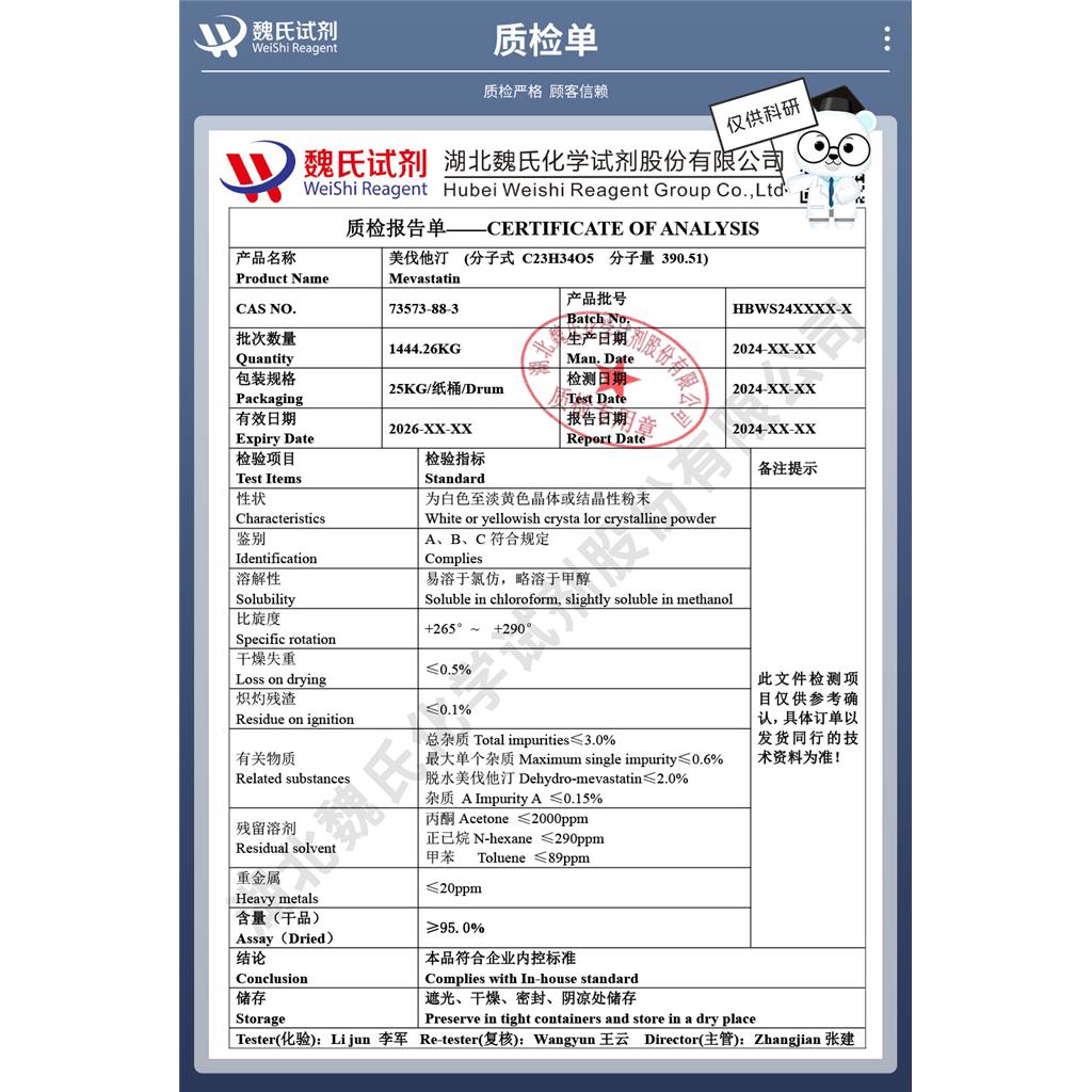 脱水美伐他汀≤2.0% 丙酮≤2000ppm 正已烷≤290ppm