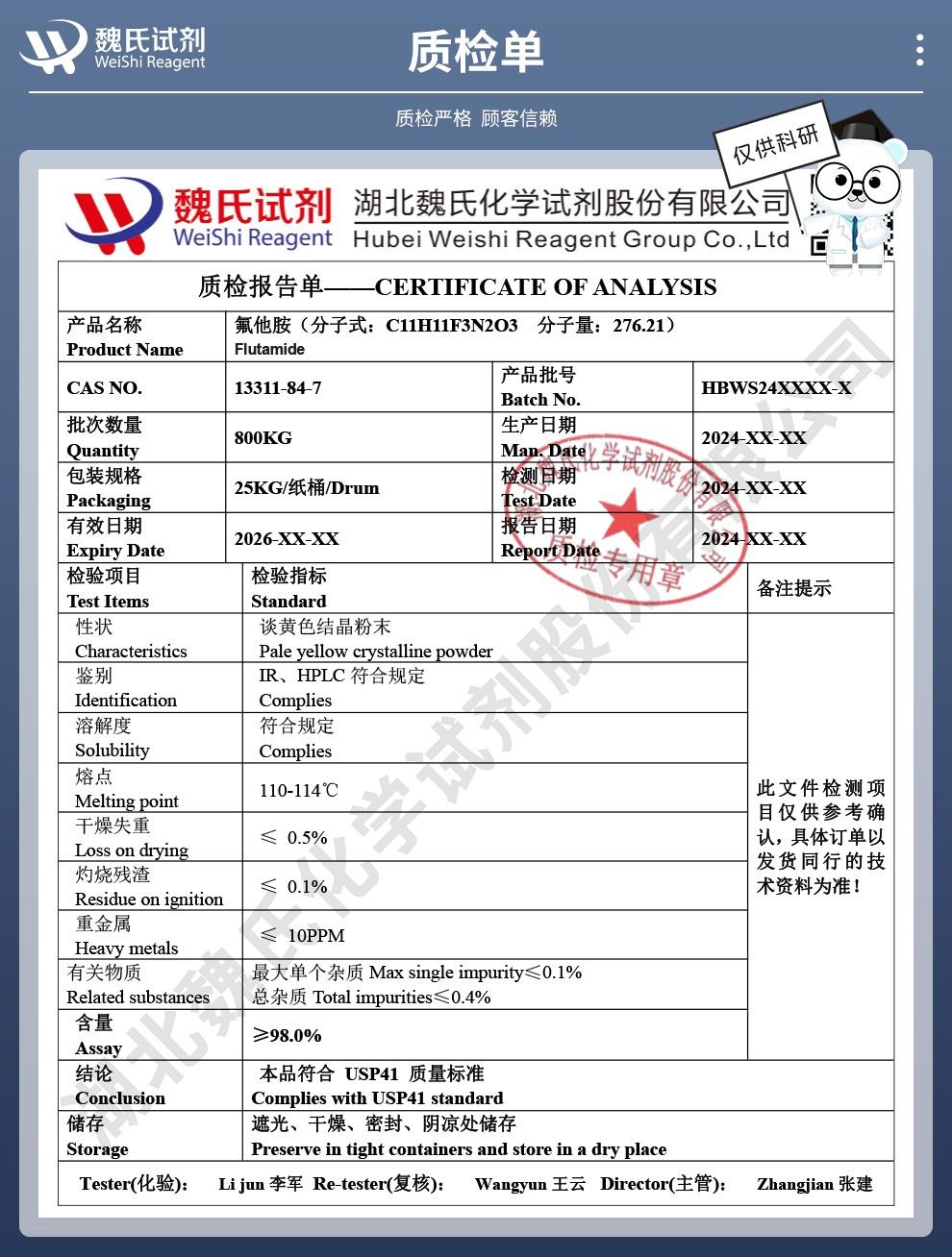 作用:用于外贸出口、科学研究和化学试剂等领域 储存:遮光干燥密封储存 有效期2年