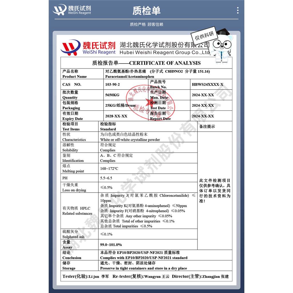 湖北魏氏化学试剂股份有限公司 分析试剂—现货供应商服务热线:刘经理 13125137732(微信同号)QQ客服2853863890现货库存+当天订单可以发顺丰快递+开票含运费+付款订单后提供质检单 作用:用于外贸出口、科学研究和化学试剂等领域储存:遮光干燥密封储存 有效期4年