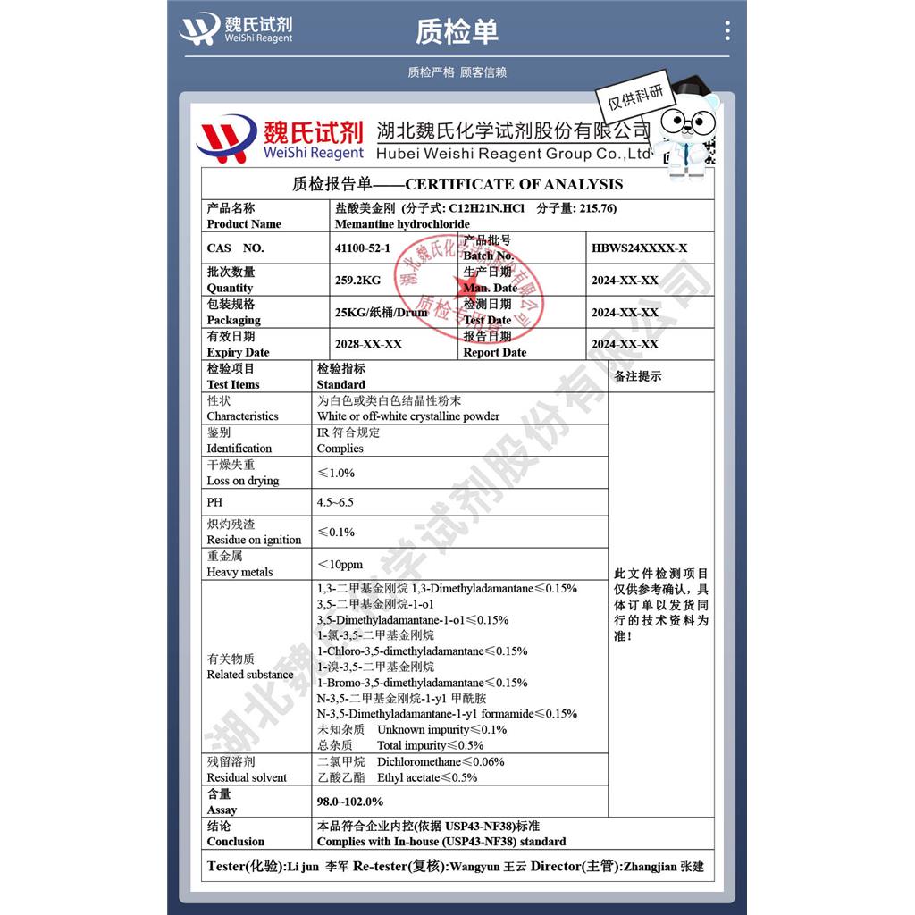 湖北魏氏化学试剂股份有限公司 分析试剂—现货供应商服务热线:刘经理 13125137732(微信同号)QQ客服2853863890现货库存+当天订单可以发顺丰快递+开票含运费+付款订单后提供质检单 作用:用于外贸出口、科学研究和化学试剂等领域储存:遮光干燥密封储存 有效期4年