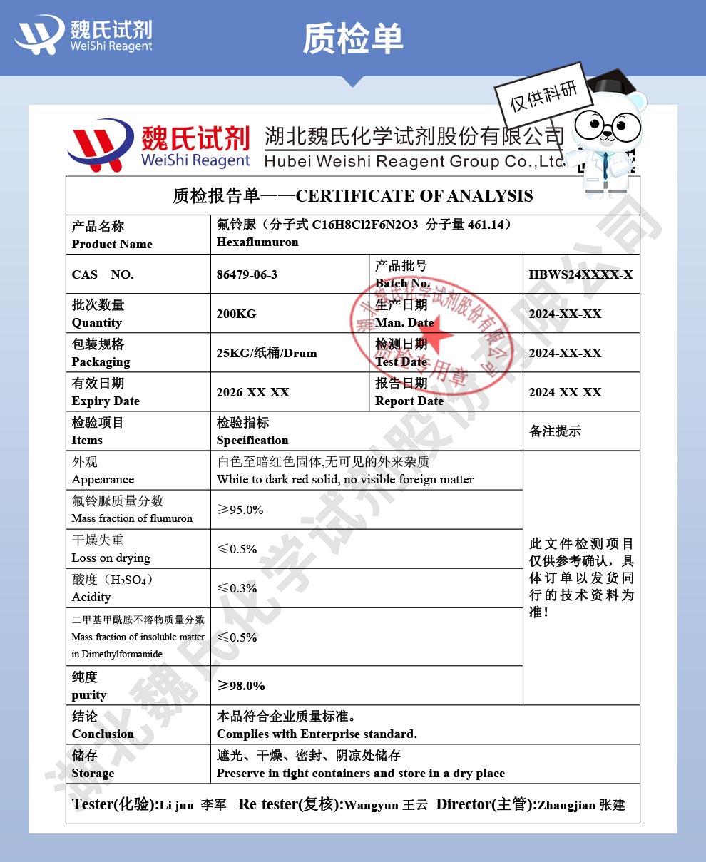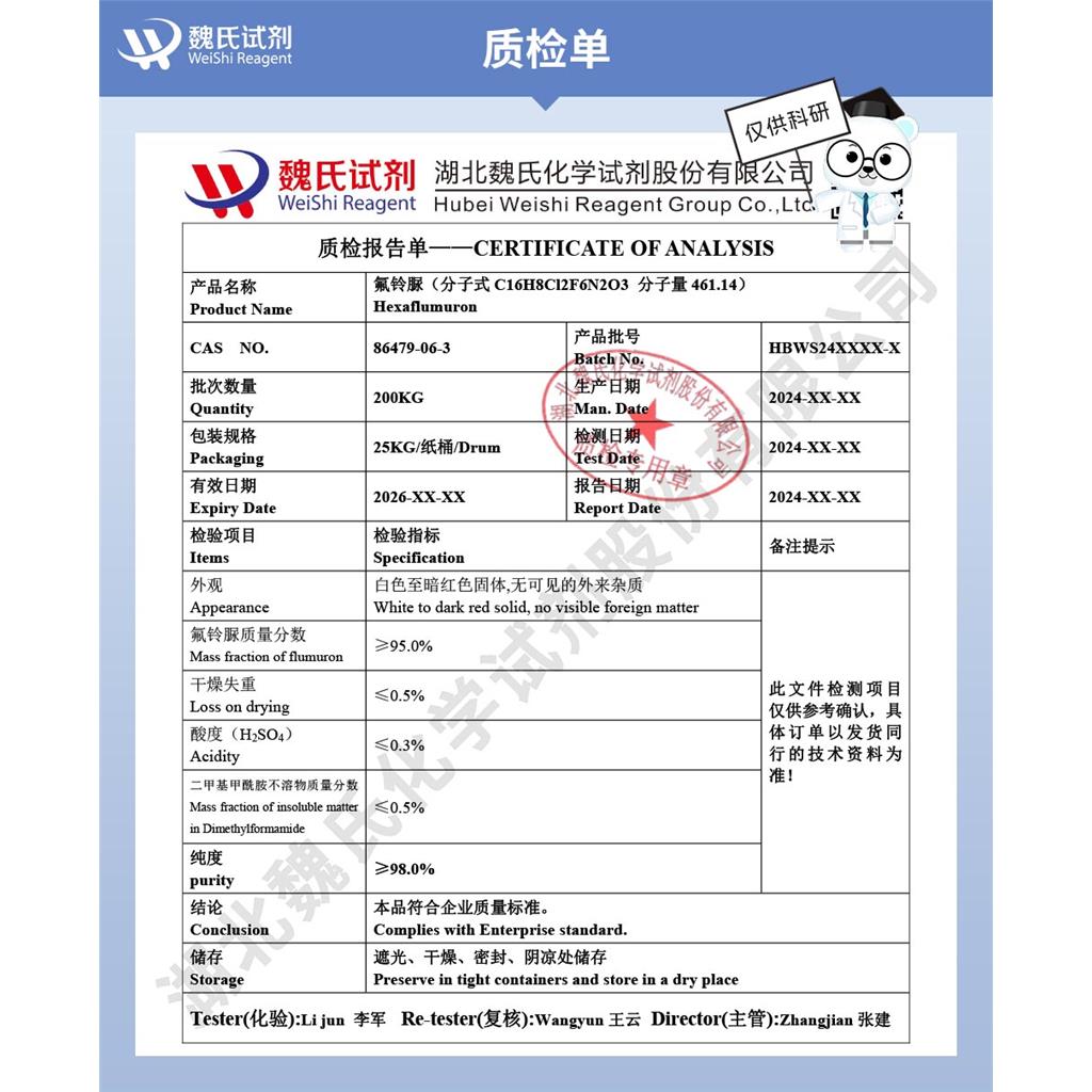 作用:用于外贸出口、科学研究和化学试剂等领域 储存:遮光干燥密封储存 有效期2年