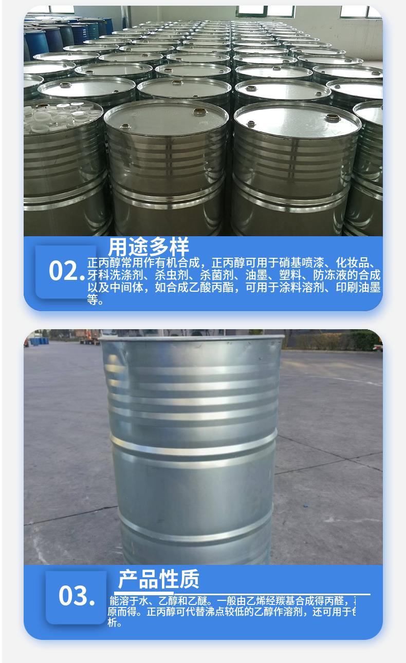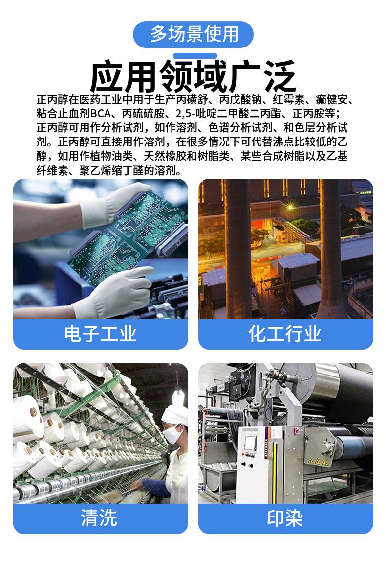 正丙醇直接用作溶剂或合成乙酸丙酯,用于涂料溶剂、印刷油墨、化妆品等,用于生产医药、农药的中间体正丙胺,用于生产饲料添加剂、合成香料等。丙醇在医药工业中用于生产丙磺舒、丙戊酸钠、红霉素、癫健安、粘合止血剂BCA、丙硫硫胺、2,5-吡啶二甲酸二丙酯等。
