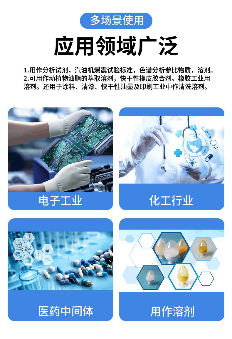 主要用作辛烷值测定的标准物、溶剂,也可用于有机合成和实验试剂的制备。