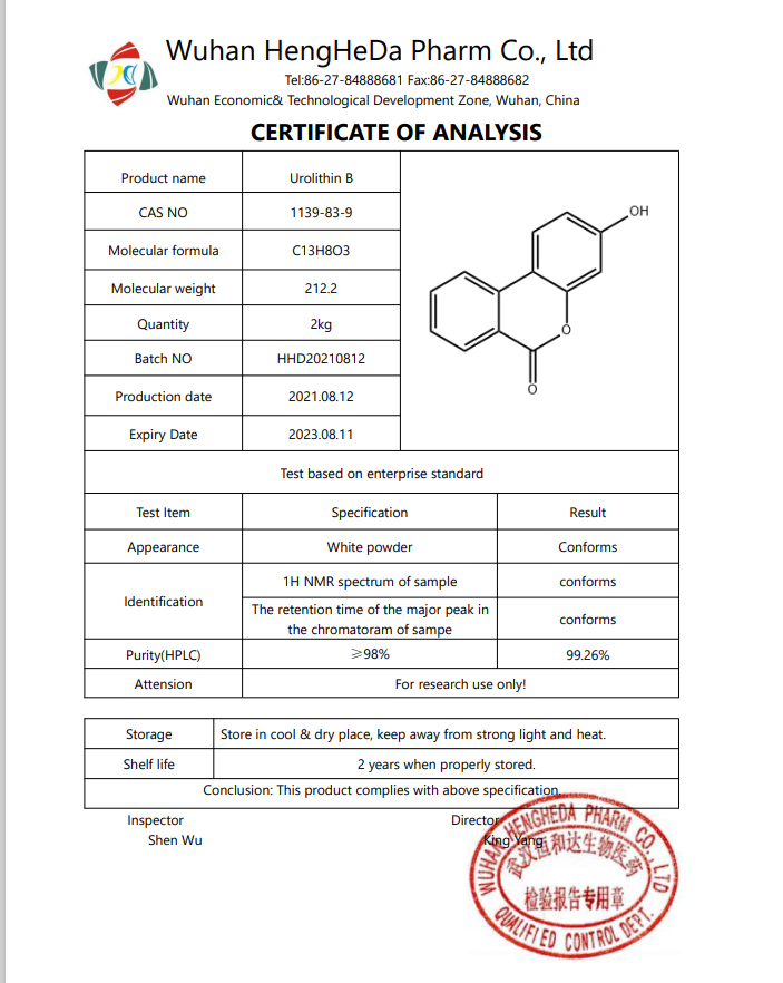 Urolithin B is a naturally occurring metabolite derived from ellagitannins, polyphenolic compounds found in fruits such as pomegranates, berries, and nuts. During digestion, gut microbiota convert ellagitannins into bioactive urolithins, with Urolithin B being one of the key end products. This compound has attracted increasing scientific interest due to its potential health-promoting properties, particularly in the areas of muscle health, anti-aging, and neuroprotection. Research suggests that Urolithin B can enhance muscle growth by activating the mTOR signaling pathway and may help reduce muscle atrophy. Additionally, it exhibits antioxidant and anti-inflammatory properties, potentially protecting cells against oxidative stress and age-related decline. Emerging studies also indicate a role in cognitive enhancement by modulating brain inflammation and promoting neuronal survival. Compared to its better-known counterpart, Urolithin A, Urolithin B is less studied but shows promising bioactivity that could be valuable in the development of nutraceuticals and sports supplements. Its efficacy, however, is influenced by individual gut microbiota composition, which determines the conversion efficiency from dietary ellagitannins.