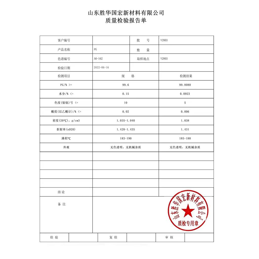 丙二醇:与水、乙醇及多种有机溶剂混溶。常态下为无色粘稠液体,近乎无味,细闻微甜。丙二醇可用作不饱和树脂的原料,在化妆品、牙膏和香皂中可与甘油或山梨醇配合用作润湿剂。在染发剂中用作调湿、匀发剂,也用作防冻剂,还可用于玻璃纸、增塑剂和制药工业。