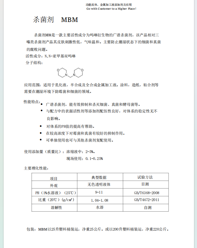 杀菌剂MBM是一款主要活性成分为吗咻衍生物的广谱杀菌剂,该产品相对三咪类杀菌剂产品其皮肤刺激性低,气味温和。主要防止潮湿状态下的细菌和真菌的腐败问题。