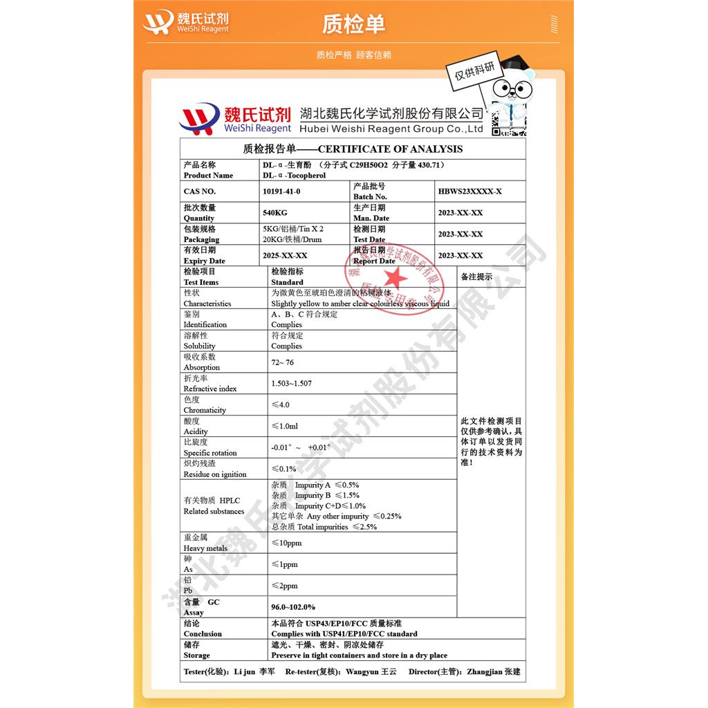 关键字: 10191-41-0 ;DL-α-生育酚;DL-alpha-Tocopherol;魏氏试剂;