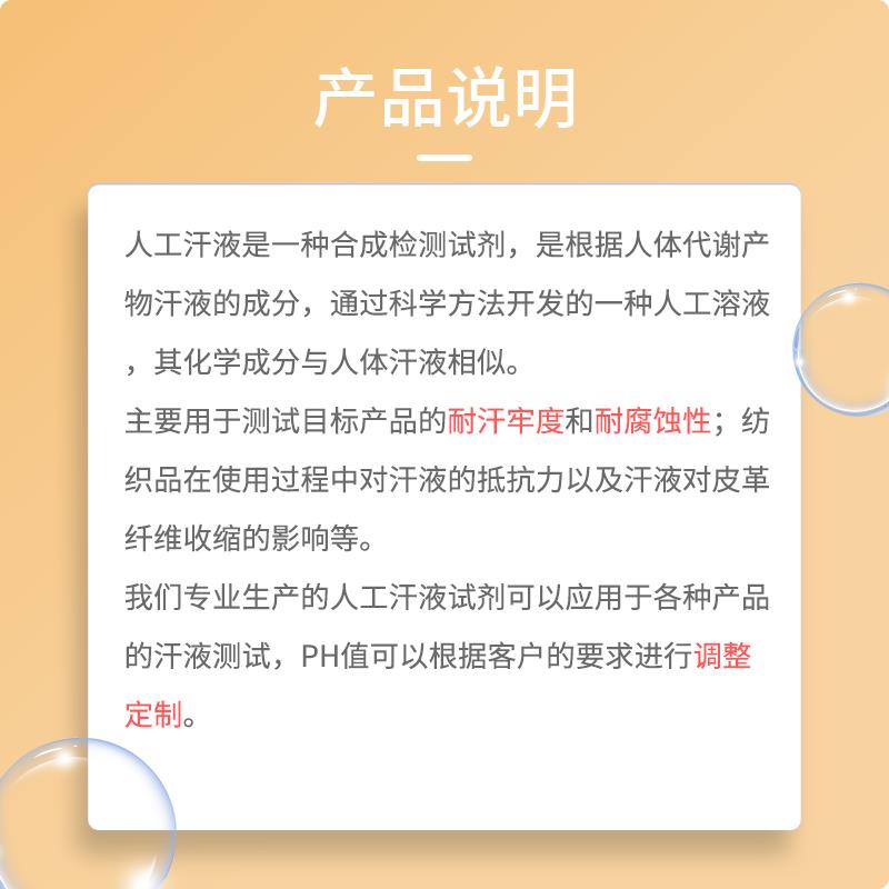 我们专业生产的人工汗液试剂可以应用于各种产品的汗液测试,PH值可以根据客户的要求进行调整定制。