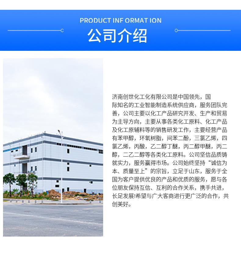 济南创世化工有限公司坐落于美丽的泉城——济南市,这里历史悠久,交通便利,是省政治、经济、文化、科技及教育中心,也是国家批准的副省级城市和沿海开放城市。公司位于济南市天桥区新材料交易中心,交通便利,距京台高速出口处1000米,距青岛港,天津港也仅有300公里路程,东邻济南传化物流基地,为广大用户提供便捷的物流配送。公司是一家集科研,生产,销售为一体的现代化化工企业,我们凭借雄厚的技术力量,积极推动着专业产品的技术进步和品质发展公司,以诚信合作。
