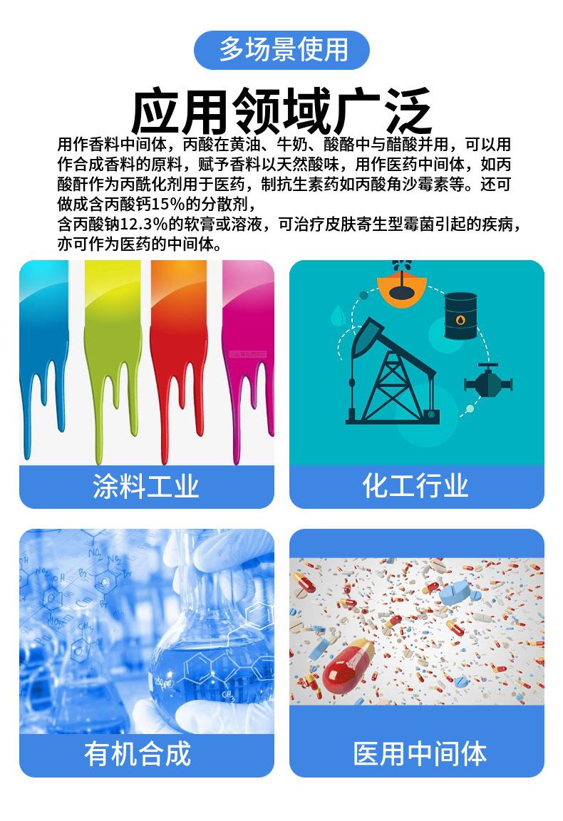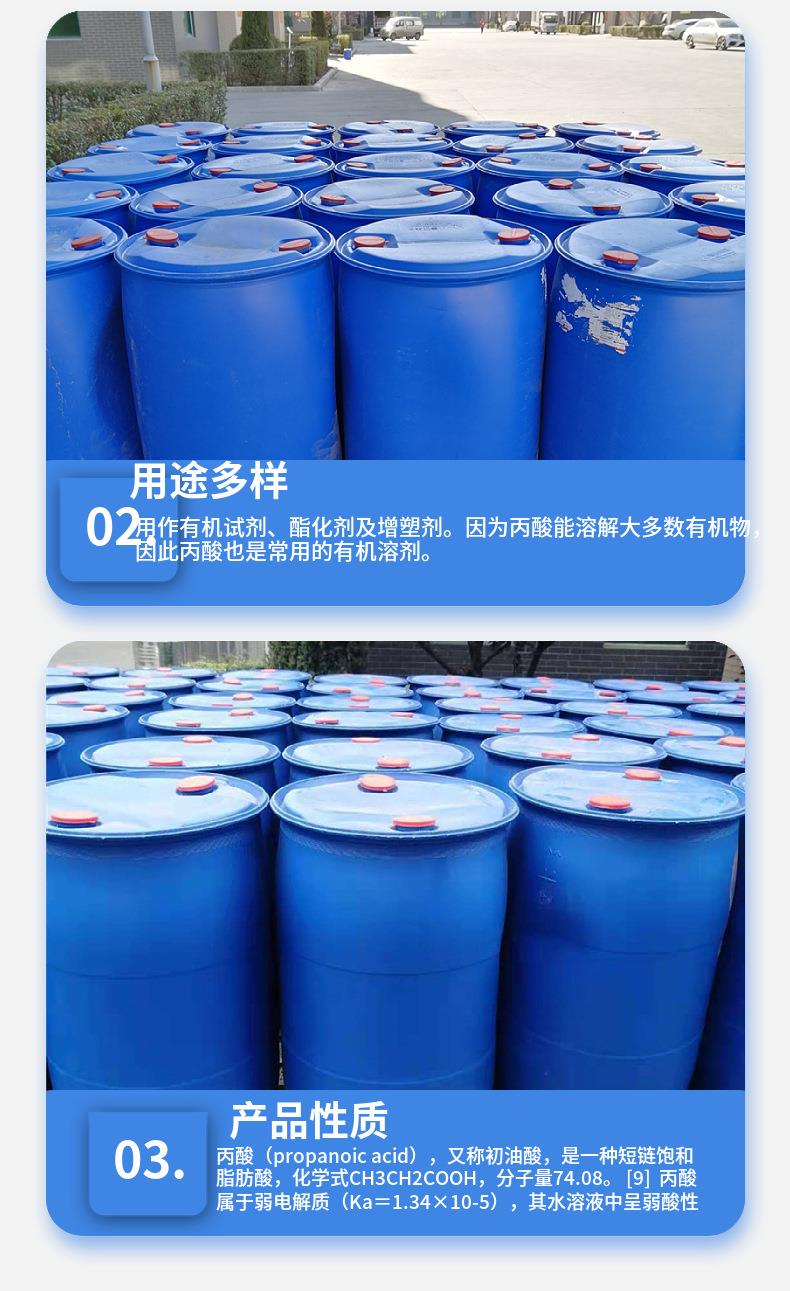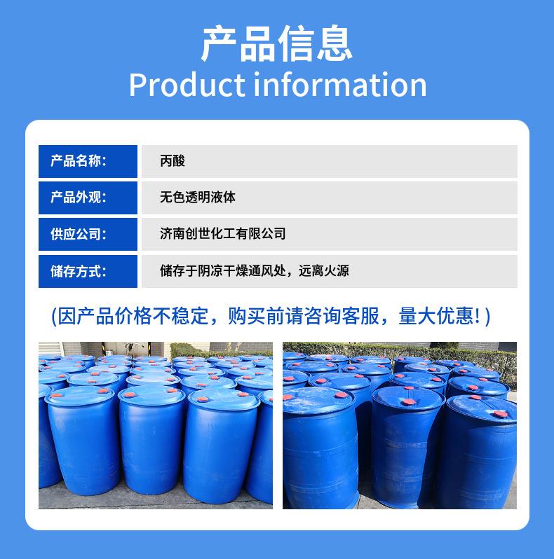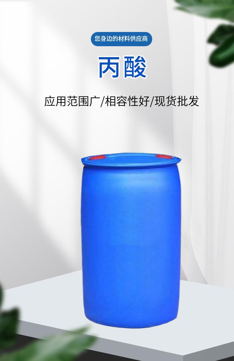 济南创世化工供应鲁西丙酸,200kg一桶,99.9含量,丙酸又称初油酸,是一种短链饱和脂肪酸,化学式CH3CH2COOH,分子量74.08。丙酸属于弱电解质(Ka=1.34×10-5),其水溶液中呈弱酸性,但腐蚀性强,蒸汽对皮肤和刺激性。常温常压下丙酸是无色澄清油状液体,有难闻的酸败刺鼻气味,能与水、乙醇、氯仿和乙醚混溶。现货速发。