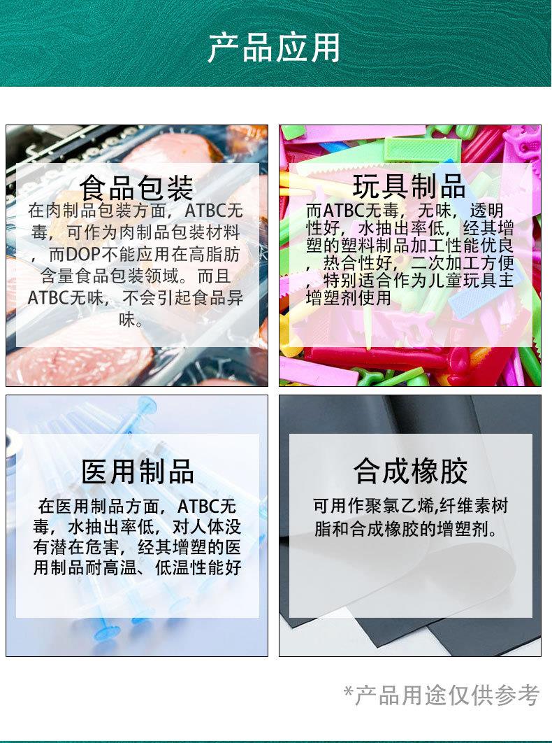 - ATBC 主要用作塑料增塑剂,可用于聚氯乙烯(PVC)、聚乙烯(PE)、聚丙烯(PP)等塑料的制造中,增加其柔软性和韧性。