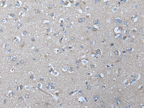 The image is immunohistochemistry of paraffin-embedded Human brain tissue using (VRK2 Antibody) at dilution 1/50. (Original magnification: ×200)