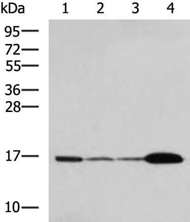 Gel: 12%SDS-PAGE, Lysate: 40 μg, Lane 1-5: Mouse brain tissue, Hela cell, LNCAP cell, HepG2 cell, Jurkat cell lysates, Primary antibody: (UBE2N Antibody) at dilution 1/800, Secondary antibody: Goat anti rabbit IgG at 1/5000 dilution, Exposure time: 30 seconds