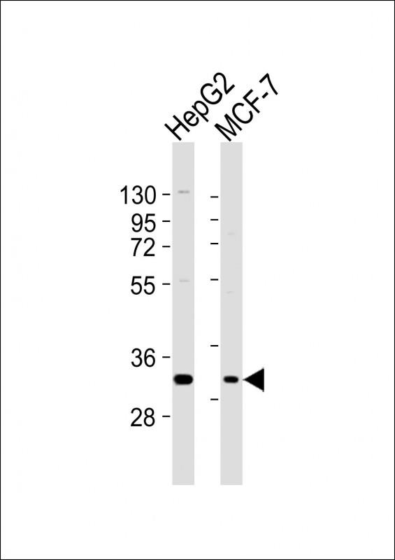 All lanes : Anti-DBP Antibody (C-term) at 1:2000 dilution Lane 1: HepG2 whole cell lysates Lane 2: MCF-7 whole cell lysates Lysates/proteins at 20 µg per lane. Secondary Goat Anti-Rabbit IgG, (H+L), Peroxidase conjugated at 1/10000 dilution Predicted band size : 34 kDa Blocking/Dilution buffer: 5% NFDM/TBST.