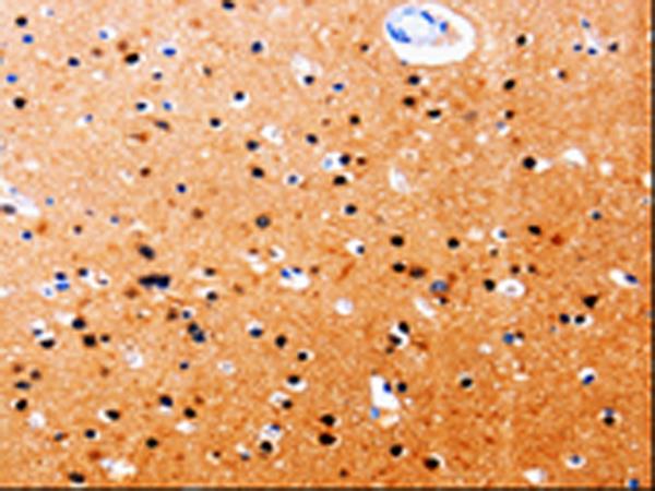 The image is immunohistochemistry of paraffin-embedded Human brain tissue using (GDI1 Antibody) at dilution 1/20. (Original magnification: ×200)