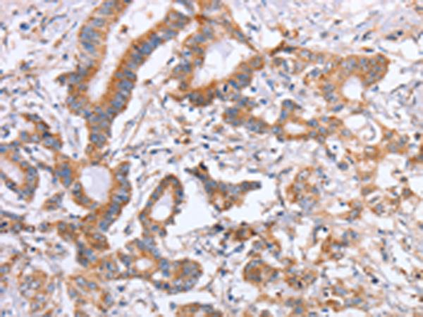 The image is immunohistochemistry of paraffin-embedded Human colon cancer tissue using (ITGB5 Antibody) at dilution 1/25. (Original magnification: ×200)
