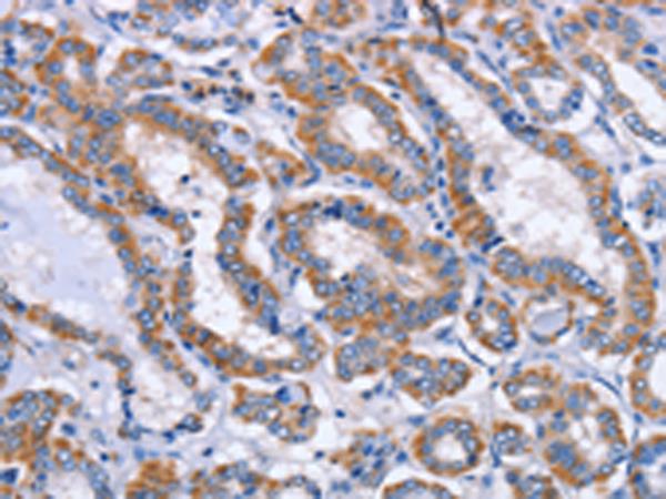 The image is immunohistochemistry of paraffin-embedded Human thyroid cancer tissue using (ITGB5 Antibody) at dilution 1/25. (Original magnification: ×200)