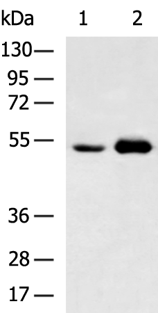 Gel: 8%SDS-PAGE, Lysate: 40 μg, Lane 1-2: NIH/3T3 cell, Human tonsil tissue lysates, Primary antibody: (POU2F2 Antibody) at dilution 1/600, Secondary antibody: Goat anti rabbit IgG at 1/5000 dilution, Exposure time: 5 minutes