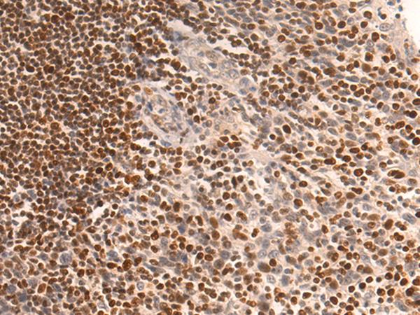 The image is immunohistochemistry of paraffin-embedded Human tonsil tissue using (POU2F2 Antibody) at dilution 1/40. (Original magnification: ×200)