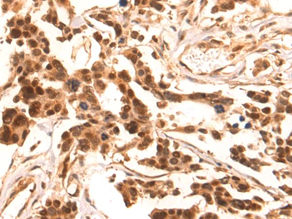 The image is immunohistochemistry of paraffin-embedded Human colorectal cancer tissue using (POU2F2 Antibody) at dilution 1/40. (Original magnification: ×200)