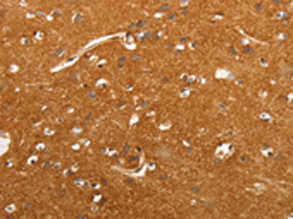 The image is immunohistochemistry of paraffin-embedded Human brain tissue using (SLC4A4 Antibody) at dilution 1/50. (Original magnification: ×200)