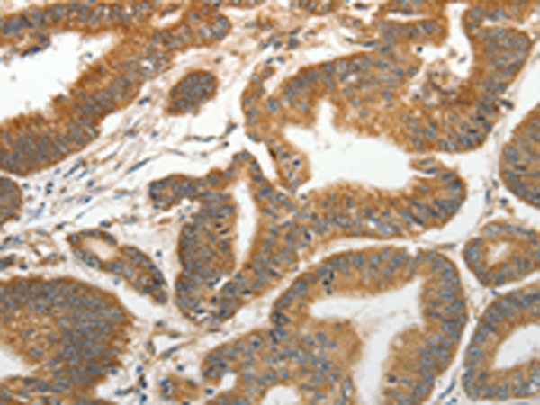 The image is immunohistochemistry of paraffin-embedded Human colon cancer tissue using (SLC4A4 Antibody) at dilution 1/50. (Original magnification: ×200)