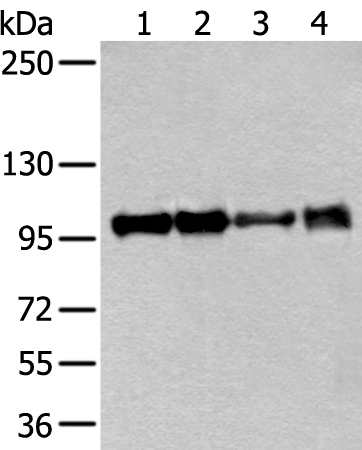 Gel: 6%SDS-PAGE, Lysate: 40 μg, Lane 1-4: 231, A549 and Hela cell, Human fetal muscle tissue lysates, Primary antibody: (ACTN1 Antibody) at dilution 1/500, Secondary antibody: Goat anti rabbit IgG at 1/8000 dilution, Exposure time: 20 seconds