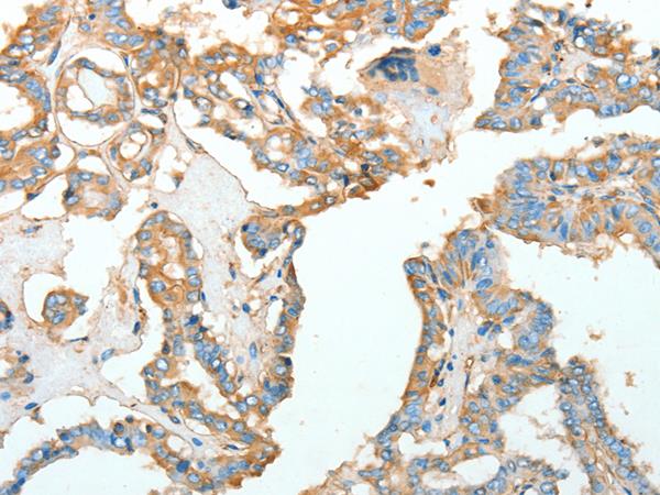 The image is immunohistochemistry of paraffin-embedded Human thyroid cancer tissue using (ACTN1 Antibody) at dilution 1/10. (Original magnification: ×200)