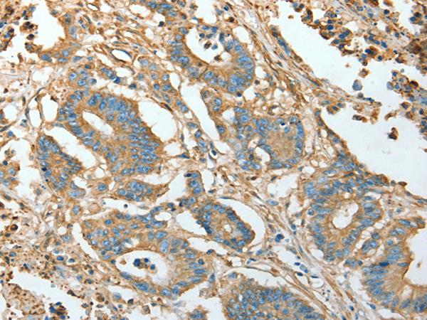 The image is immunohistochemistry of paraffin-embedded Human colon cancer tissue using (ACTN1 Antibody) at dilution 1/10. (Original magnification: ×200)