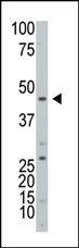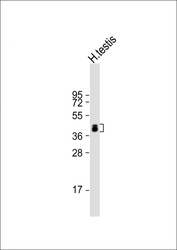 Anti-ART3 Antibody at 1:4000 dilution + human testis lysate Lysates/proteins at 20 µg per lane. Secondary Goat Anti-Rabbit IgG, (H+L), Peroxidase conjugated at 1/10000 dilution. Predicted band size : 44 kDa Blocking/Dilution buffer: 5% NFDM/TBST.