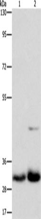 Gel: 8%SDS-PAGE, Lysate: 40 μg, Lane 1-2: Lovo cells, PC3 cells, Primary antibody: (MPG Antibody) at dilution 1/950, Secondary antibody: Goat anti rabbit IgG at 1/8000 dilution, Exposure time: 1 minute