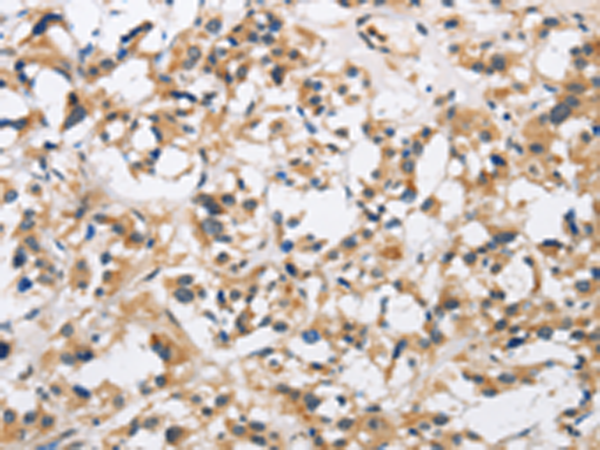 The image is immunohistochemistry of paraffin-embedded Human thyroid cancer tissue using (CKMT2 Antibody) at dilution 1/60. (Original magnification: ×200)