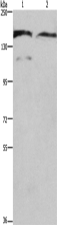 Gel: 6%SDS-PAGE, Lysate: 40 μg, Lane 1-2: 293T cells, human fetal brain tissue, Primary antibody: (DCTN1 Antibody) at dilution 1/200, Secondary antibody: Goat anti rabbit IgG at 1/8000 dilution, Exposure time: 20 seconds