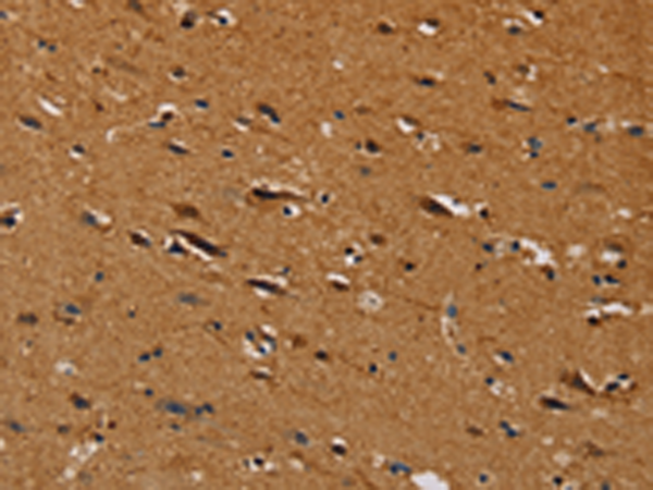 The image is immunohistochemistry of paraffin-embedded Human brain tissue using (CENPU Antibody) at dilution 1/30. (Original magnification: ×200)