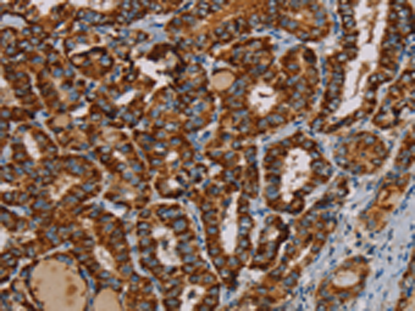The image is immunohistochemistry of paraffin-embedded Human thyroid cancer tissue using (MRPL12 Antibody) at dilution 1/25. (Original magnification: ×200)