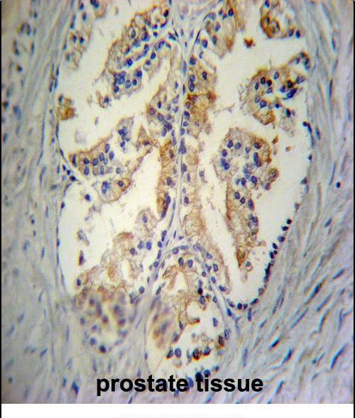 STC2 Antibody (C-term) immunohistochemistry analysis in formalin fixed and paraffin embedded human prostate tissue followed by peroxidase conjugation of the secondary antibody and DAB staining.This data demonstrates the use of STC2 Antibody (C-term) for immunohistochemistry. Clinical relevance has not been evaluated.