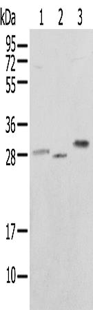 Gel: 12%SDS-PAGE, Lysate: 40 μg, Lane 1-3: 293T cell, Mouse skeletal muscle tissue and HEPG2 cell, Primary antibody: (UBE2J2 Antibody) at dilution 1/250, Secondary antibody: Goat anti rabbit IgG at 1/8000 dilution, Exposure time: 3 seconds