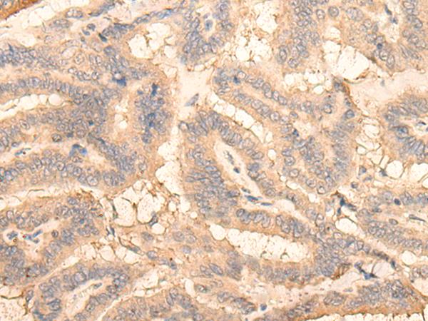 The image is immunohistochemistry of paraffin-embedded Human thyroid cancer tissue using (RPL3 Antibody) at dilution 1/20. (Original magnification: ×200)
