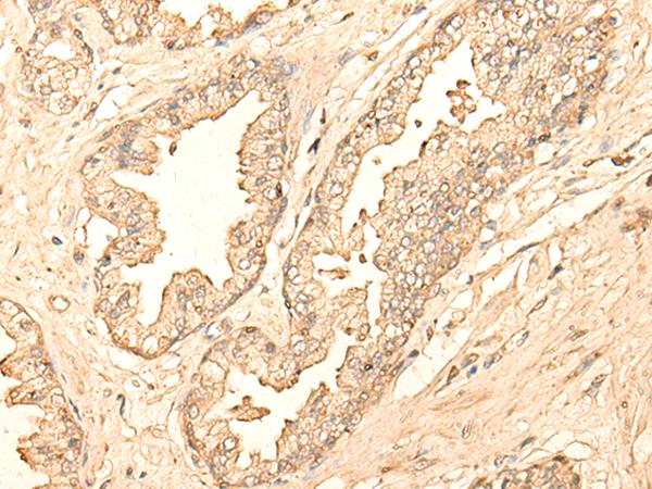The image is immunohistochemistry of paraffin-embedded Human prostate cancer tissue using (RPL3 Antibody) at dilution 1/20. (Original magnification: ×200)