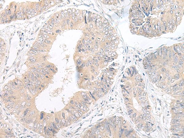 The image is immunohistochemistry of paraffin-embedded Human colorectal cancer tissue using (LYRM2 Antibody) at dilution 1/50. (Original magnification: ×200)