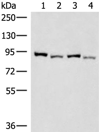 Gel: 6%SDS-PAGE, Lysate: 40 μg, Lane 1-4: HepG2, Hela, 231 cell and Human fetal brain tissue lysates, Primary antibody: (CUL4A Antibody) at dilution 1/500, Secondary antibody: Goat anti rabbit IgG at 1/8000 dilution, Exposure time: 3 seconds