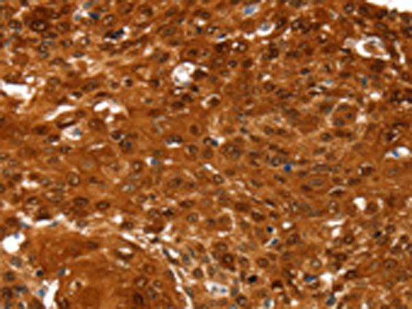 The image is immunohistochemistry of paraffin-embedded Human esophagus cancer tissue using (NCOR1 Antibody) at dilution 1/60. (Original magnification: ×200)