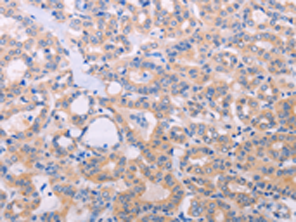 The image is immunohistochemistry of paraffin-embedded Human thyroid cancer tissue using (ADCY5 Antibody) at dilution 1/30. (Original magnification: ×200)