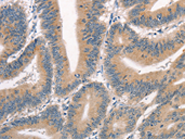 The image is immunohistochemistry of paraffin-embedded Human colon cancer tissue using (CRIM1 Antibody) at dilution 1/25. (Original magnification: ×200)