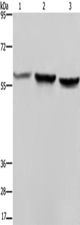 Gel: 6%SDS-PAGE, Lysate: 40 μg, Lane 1-3: Hela cells, A375 cells, LoVo cells, Primary antibody: (SYN2 Antibody) at dilution 1/1400, Secondary antibody: Goat anti rabbit IgG at 1/8000 dilution, Exposure time: 40 seconds